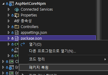 안되는 경우에는 'package.json'에서 오른쪽 클릭을 하고 '패키지 복원'을 선택해 줍니다.