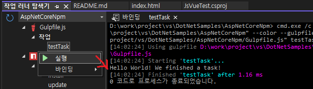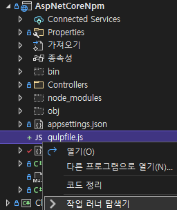 솔루션 탐색기에서 'gulpfile.js'파일을 오른쪽 클릭하고 '작업 러너 탐색기'를 실행합니다.