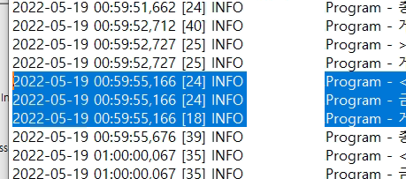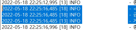 강조된 로그가 3줄인데 첫 줄과 마지막 줄은 각각 다른 요청입니다.