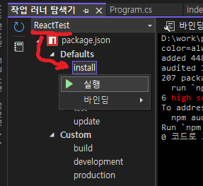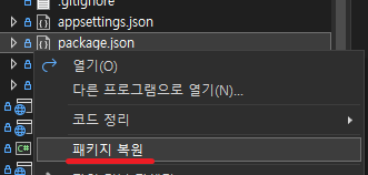 솔루션 탐색기 > package.json에서 오른쪽 클릭 > 패키지 복원