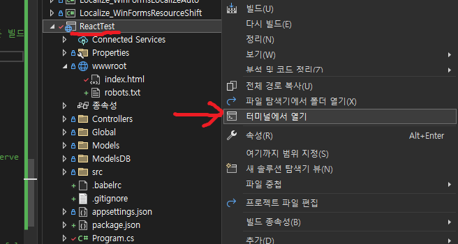 솔루션 탐색기 > 해당 프로젝트에서 오른쪽 클릭 > 터미널에서 열기