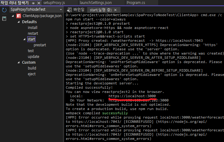 자동으로 'SpaProxyLaunchCommand'에 설정된 'npm start'명령을 실행시키면서