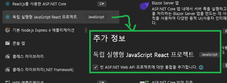 '독립 실행형 JavaScript React 프로젝트' 템플릿으로 새 프로젝트를 만듭니다.