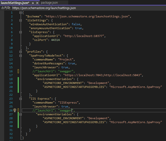 파일을 열고 'environmentVariables'항목에 'SpaProxy'설정을 추가합니다.