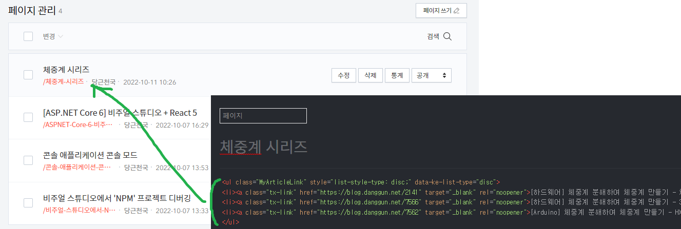 1) '페이지'에 연관글을 작성하고