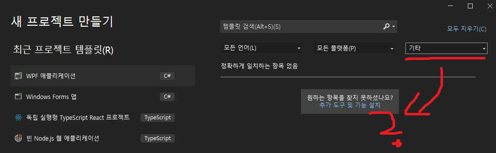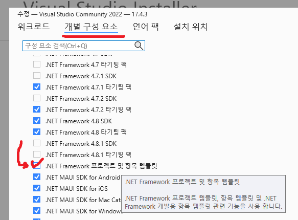 에서 '.NET Framework 프로젝트 및 항목 템플릿'을 체크하고 수정해줍니다.