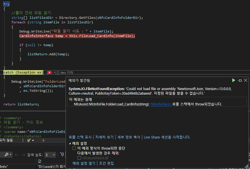 System.IO.FileNotFoundException: Could not load file or assembly 'Newtonsoft.Json, Version=13.0.0.0, Culture=neutral, PublicKeyToken=30ad4fe6b2a6aeed'. 지정된 파일을 찾을 수 없습니다. File name: 'Newtonsoft.Json, Version=13.0.0.0, Culture=neutral, PublicKeyToken=30ad4fe6b2a6aeed' at NfcAssist.NfcInfoFile.FileLoad_CardInfo(String sNfcCardInfoFileDir) at NfcAssist.NfcInfoFile.FolderLoad_CardInfo(String sNfcCardInfoFolderDir) 예외 발생: 'System.IO.FileNotFoundException'(NfcAssistNet4.dll)