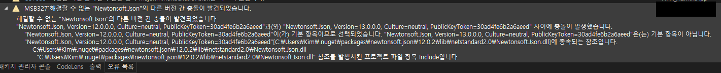 'Newtonsoft.Json'버전이 충돌났다는 경고입니다.