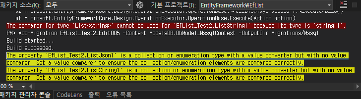 The property '[테이블].[필드]' is a collection or enumeration type with a value converter but with no value comparer. Set a value comparer to ensure the collection/enumeration elements are compared correctly.