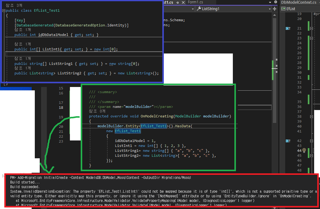 System.InvalidOperationException: 'EfList_Test1.ListInt1' 속성은 지원되는 기본 형식 또는 유효한 엔터티 형식이 아닌 'int[]' 형식이므로 매핑할 수 없습니다. 이 속성을 명시적으로 매핑하거나 '[NotMapped]' 특성을 사용하거나 'OnModelCreating'에서 'EntityTypeBuilder.Ignore'를 사용하여 무시합니다.
