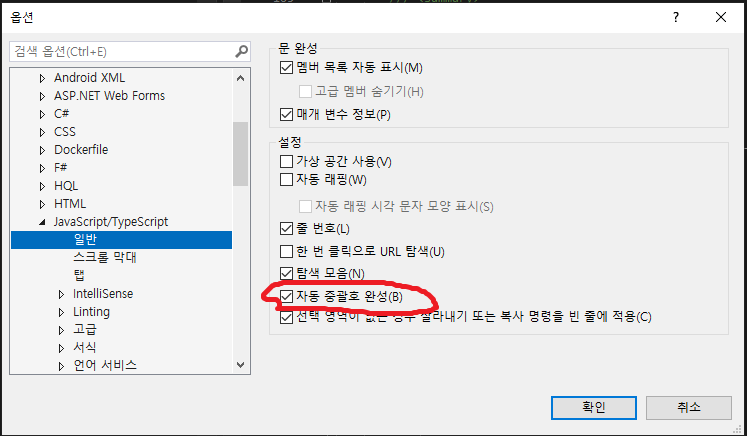 텍스트 편집기 > JavaScript/TypeScript > 일반 > 설정 > 자동 중괄호 완성