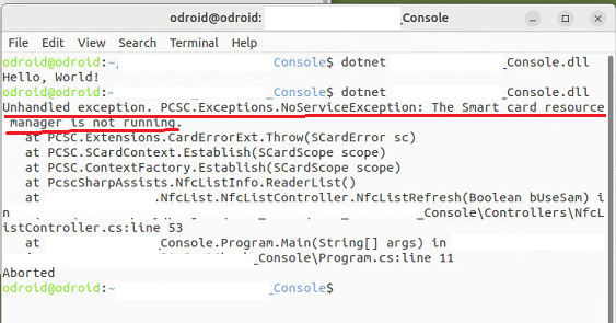 Unhandled exception. PCSC.Exceptions.NoServiceException: The Smart card resource manager is not running.