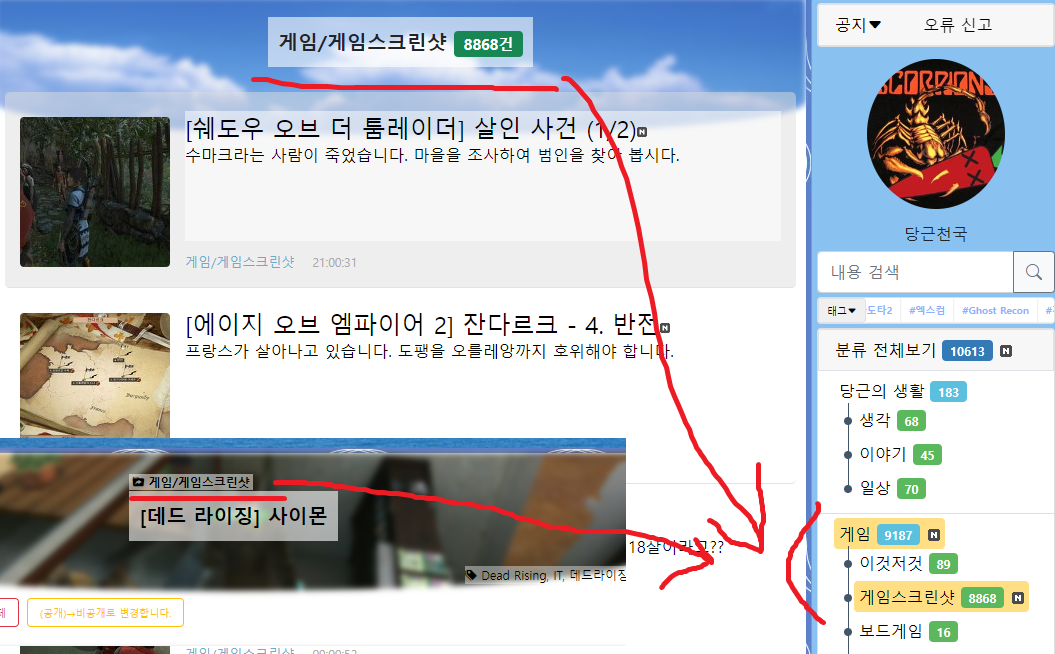 카테고리 내용 보기, 검색에서는 :