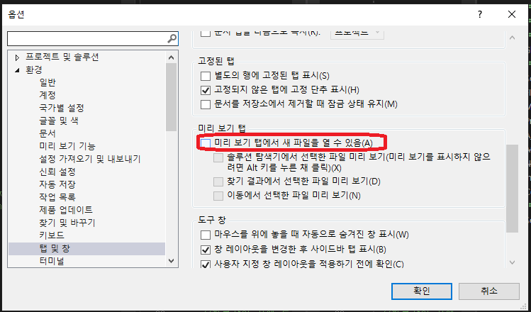 도구 > 옵션 > 환경 > 탭 및 창 > 미리 보기 탭