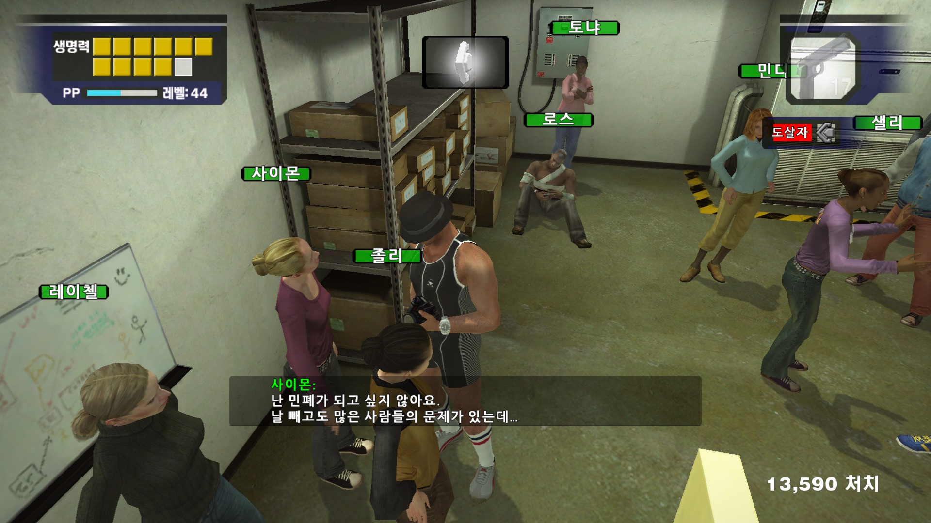 사이몬이 자기가 좀비가 될때를 대비해서 총을 가지고 있고 싶어합니다....