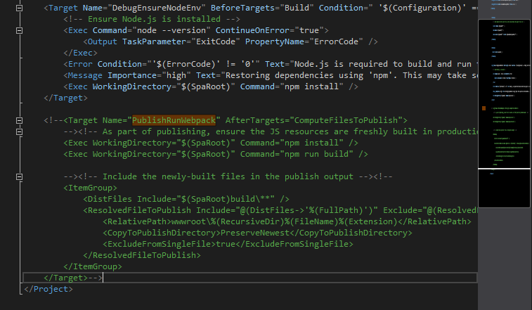 프로젝트를 더블클릭하고 'Target Name="PublishRunWebpack"'로 되어 있는 부분을 찾습니다.