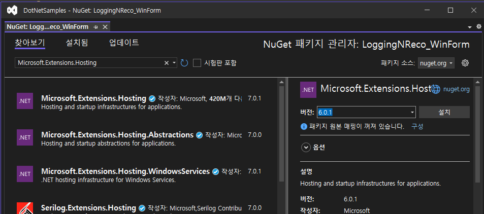 이 플랫폼에는 기본 로거가 설치되어있지 않으므로 누겟에서 찾아서 설치해 줍니다.