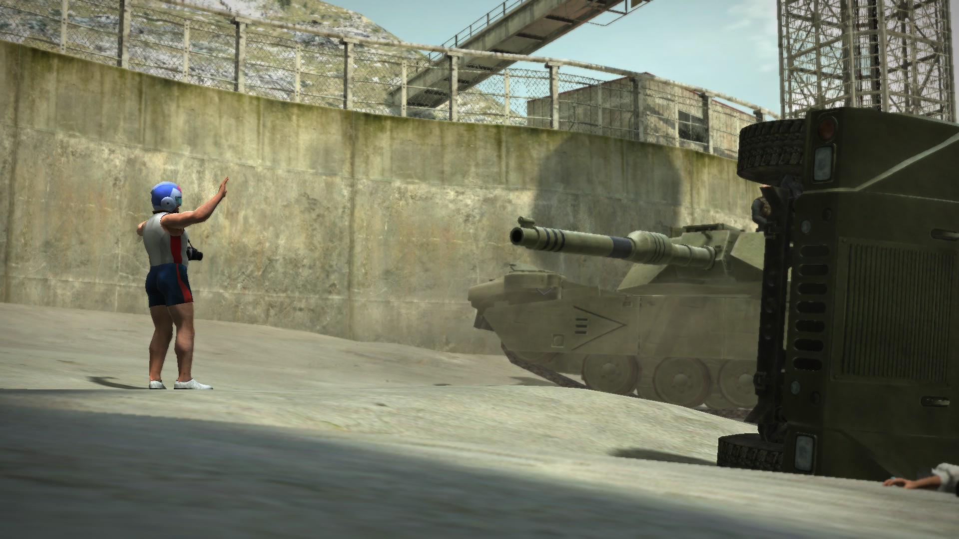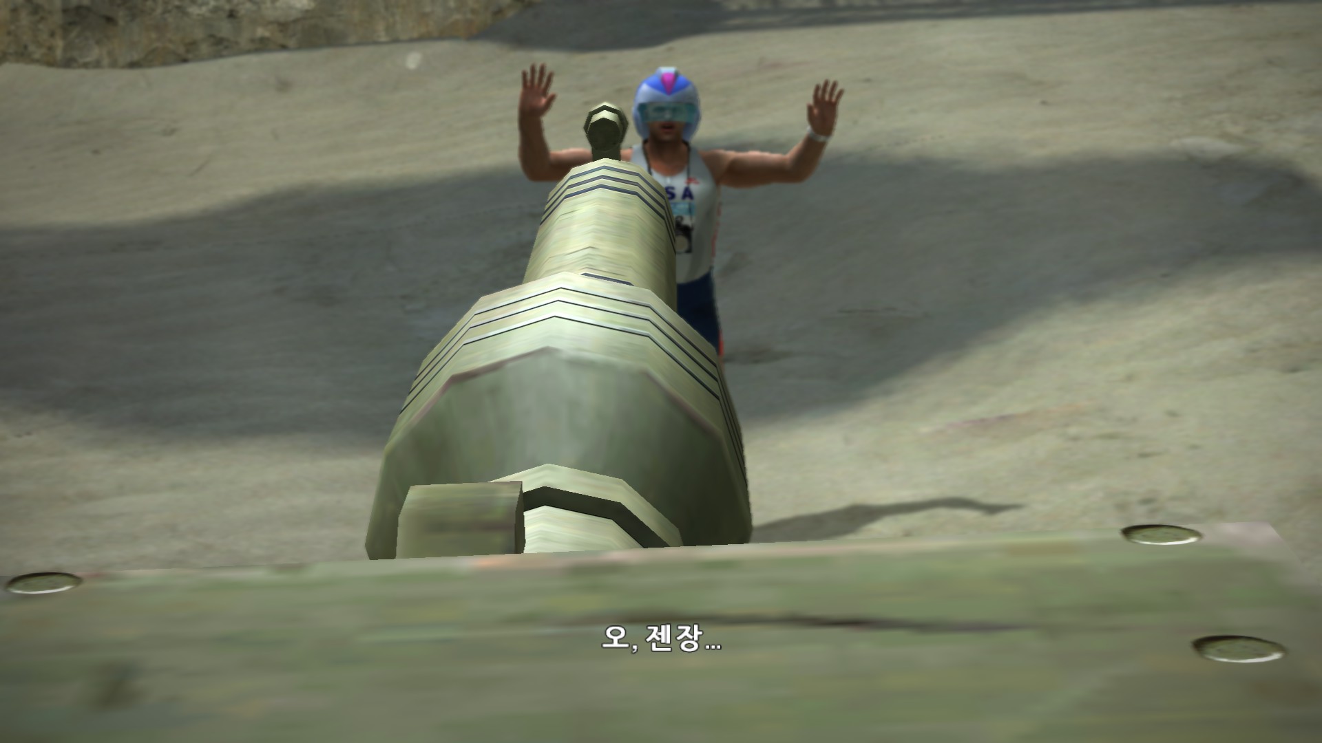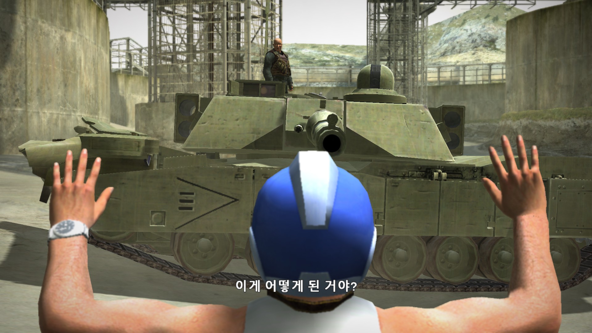 졸렬하게 탱크로 싸움걸더니 안되겠으니까 탱크위에서 주먹다짐을 합니다.