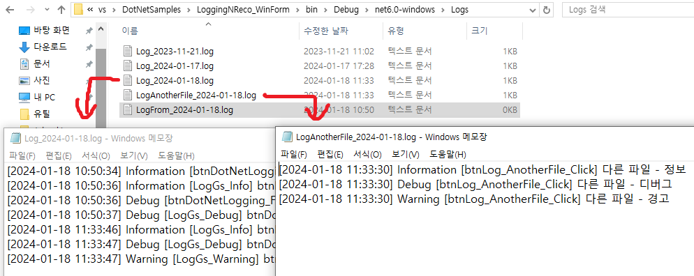 이 예제에서는 'Logs'폴더에 'Log_{0:yyyy}-{0:MM}-{0:dd}.log'형식으로 출력됩니다.