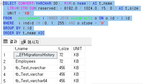 ('sp_spaceused'와 'sysindexes.reserved'는 같은 용량 나오는게 맞습니다.)