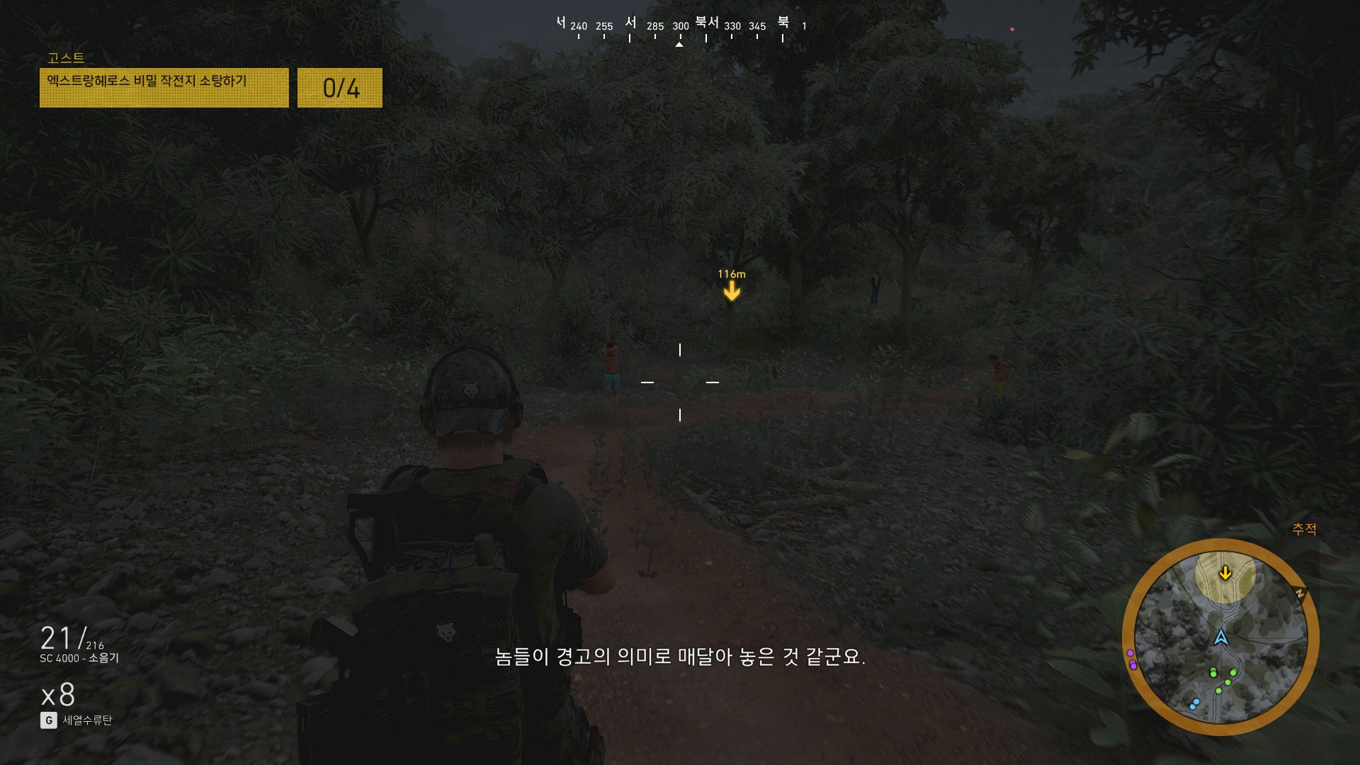 광학미채 입은 병사들이 마을하나 쓸어버리겠다고 몰려오고 있습니다.