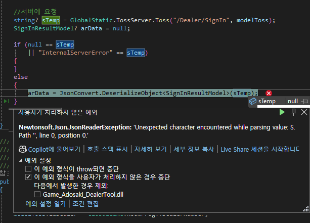 자주 쓰는 라이브러리인 'Newtonsoft.Json'을 사용할 때 잘못된 문자열이 들어가면 자주 보이는 오류라 좀 보이는 오류라는 착각이 있지