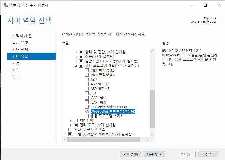 서버 관리자 > 역할 및 기능 추가 > Web Server(IIS) > Web Server > Application Development > WebSocket Protocol