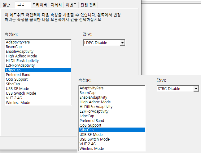 - 고급 탭에 들어가서 LdpcCap, StbcCap를 Disable로 바꿔줍니다.