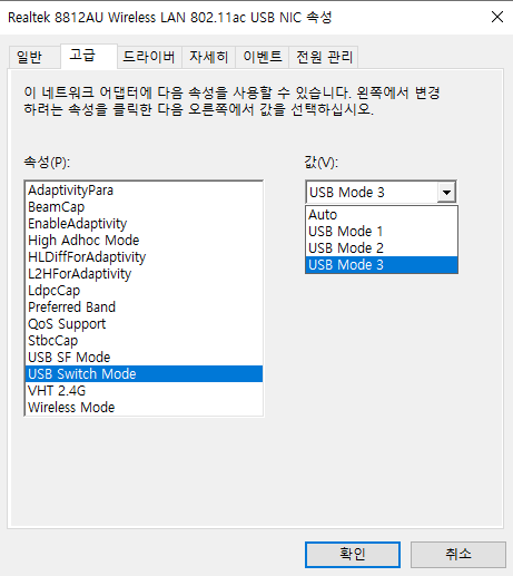 - 속성 > 고급(참고 : 2021.05.21.)에 USB Switch Mode를 'USB Mode 3'으로 바꿔봅니다.