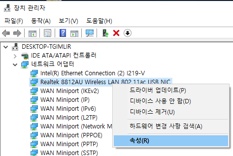 - 장치 관리자에서 연결된 USB 랜카드에서 오른쪽 클릭을 해서 속성을 들어갑니다.