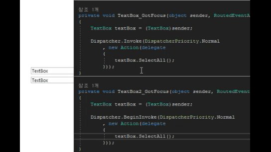 그냥 인보크는 'textBox.SelectAll();'가 동작을 안 하는 것처럼 보이고