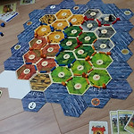 모든 자원을 같이 두는 맵입니다. 빨간 숫자를 각 자원에 2개씩 먼저 넣고 나머지 숫자는 랜덤하게 놓는 방식으로 만들었습니다. 항구는 반대편에 있는 자원항구가 될 수 있도록 배치하고 3항구는 사막을 무조건 끼게 배치했습니다. 이 맵의 특징은 "영원한 적도 아군도 없다."입니다. 맵의 특징상 각 플레이어는 한가지 자원만 넘치는 현상이 계속 발생하기 때문에 상황에 따른 전략적인 교환이 중요합니다. 자원이 많이 나기 때문에 쉽게 7장이 넘습니다. 그러니 7장을 안 넘기려는 작전보다 넘겨서 버려도 타격 없게 유지하는 작전이 더 효율적입니다. 이 맵은 숫자 배치만 잘하면 벨런스가 좋은 맵인 것같습니다. 교환을 안 하면 답이 없다 보니 카탄의 재미 중 하나인 교환에 의한 주종관계가 계속 바뀌게 됩니다 ㅎㅎㅎㅎ